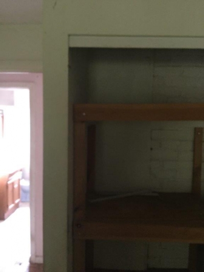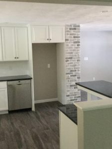 The kitchen was an area that needed to be large and open to the front room. We took down the wall from the living room and opened up the wall to look into the new room that we created. Now, when someone  comes in the front door, they can see right through into the room with the slider. Today’s young couples like an open floor plan. The chimney that is in the center of the house was painted an off-white and was in rough looking shape, so I chose to have it painted in a taupe color with high and low shading by a good friend who paints accent walls and tiles. It gave the house an accent wall that stood out nicely.