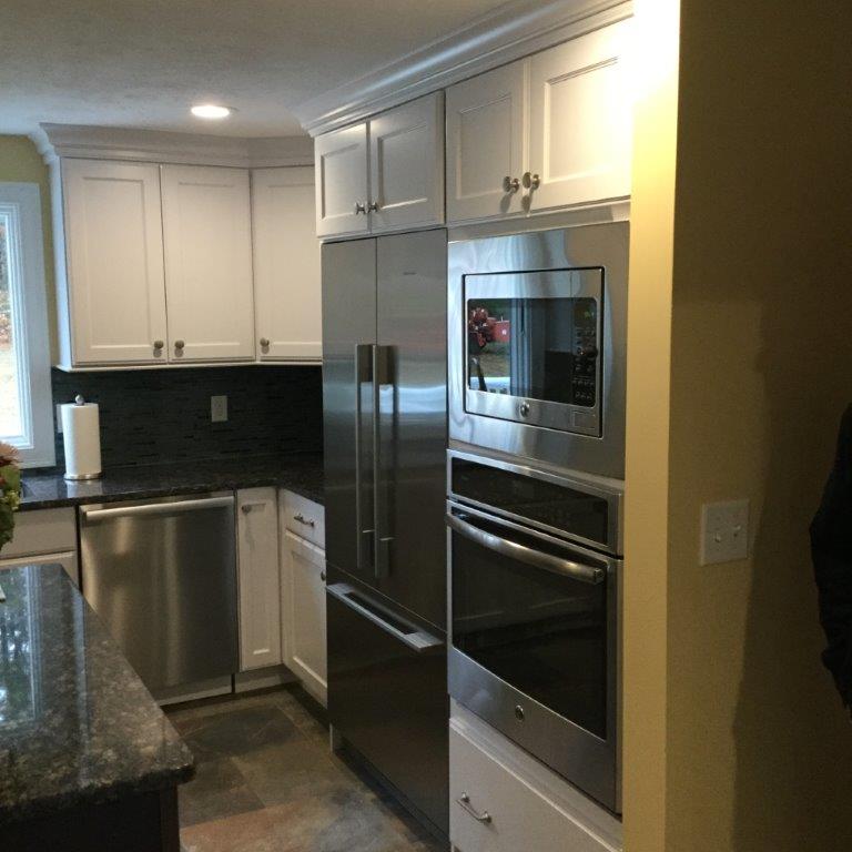 Our clients had your typical 80’s oak kitchen and decor. Worn out cabinets, 30″ stove, vinyl floors, blue laminated counter top and the famous 80’s round open shelves. Good storage was lacking, and the old drawers and doors were not working well. The dated look of the kitchen did not reflect the family’s current taste. For a woman who likes to cook and entertain, her kitchen just did not work for her.