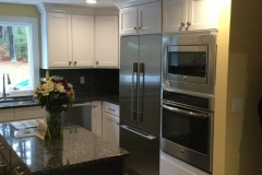 The first meeting was all about the look and the appliances that she had been longing for. Beautiful stainless appliances that boast a stunning Fisher-Paykel built-in fridge helped bridge the gap between her traditional and modern/commercial appetite. The Omega cabinets chosen were a very classic and transitional door style, (Renner) in Pure White paint and Truffle Cherry. Her floor is a very beautiful slate-like tile floor that not only warms up the space but brings all the materials together. She topped it all off with a very modern, glass tile backsplash. Walking into the finished room to take pictures almost took my breath.